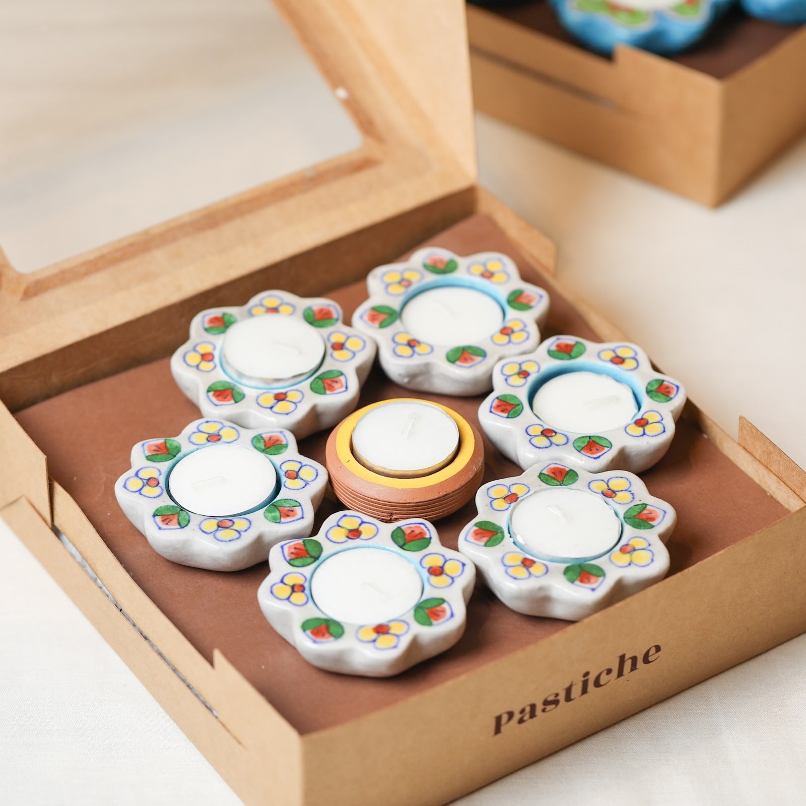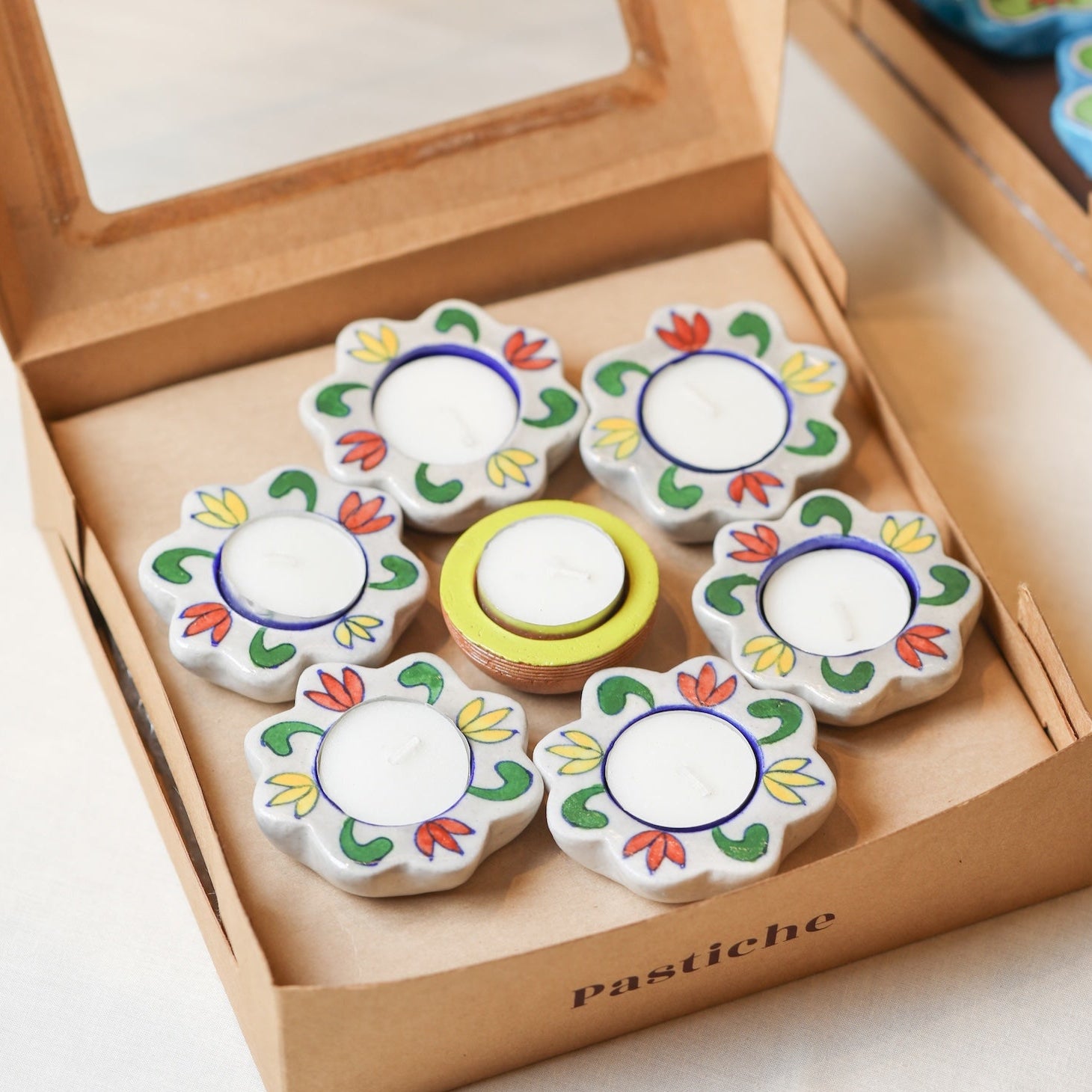 Rangoli Gift Set – Box 6 Tea-light Holder & 1 Terracotta Tea-light Holder
