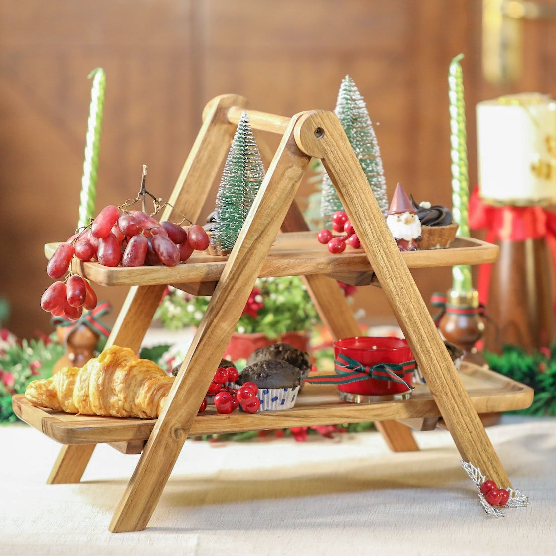 Wooden 2-Tier Serving Platter – Foldable Tiered Serving Tray