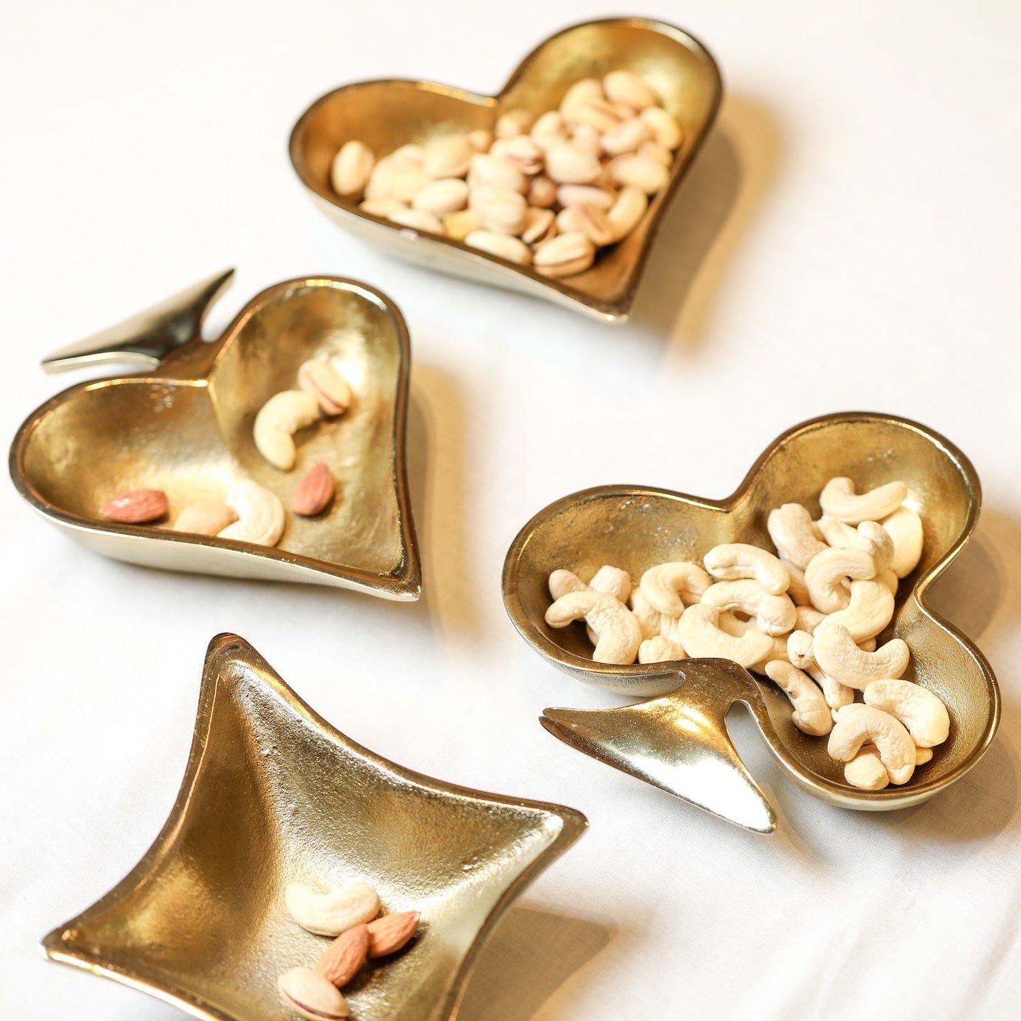 Elevate your card party experience with our Card Party Bowl Set, a delightful ensemble of four uniquely shaped bowls—spade, heart, club, and diamond. Crafted with precision from aluminum, these bowls feature an exquisite finish in brass, adding a touch of sophistication to your table.